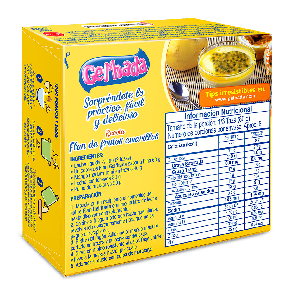 Postre de consistencia firme, a base de leche, huevo y azúcar. Sabor piña. Rendidor. Postre económico para toda la familia. Solo agregue leche.