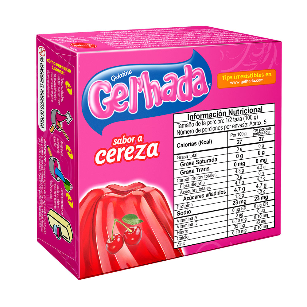 • La gelatina es una proteína pura, natural, procedente de materia prima animal, que contiene colágeno. Su consistencia firme y delicioso sabor hacen que Gel’hada sea la #1 en la mente del consumidor. Sabor a cereza. Rendidora. Postre económico para toda la familia.