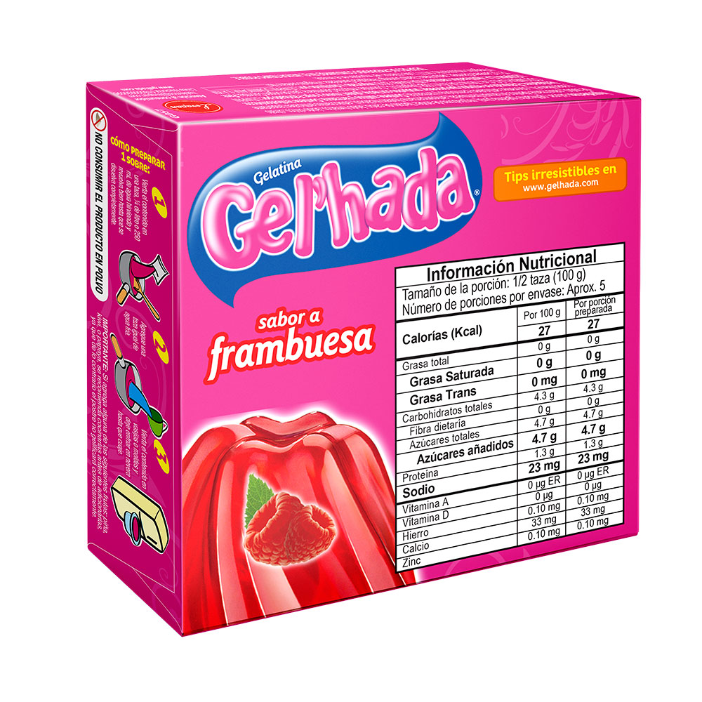• La gelatina es una proteína pura, natural, procedente de materia prima animal, que contiene colágeno. Su consistencia firme y delicioso sabor hacen que Gel’hada sea la #1 en la mente del consumidor. Sabor a frambuesa. Rendidora. Postre económico para toda la familia.
