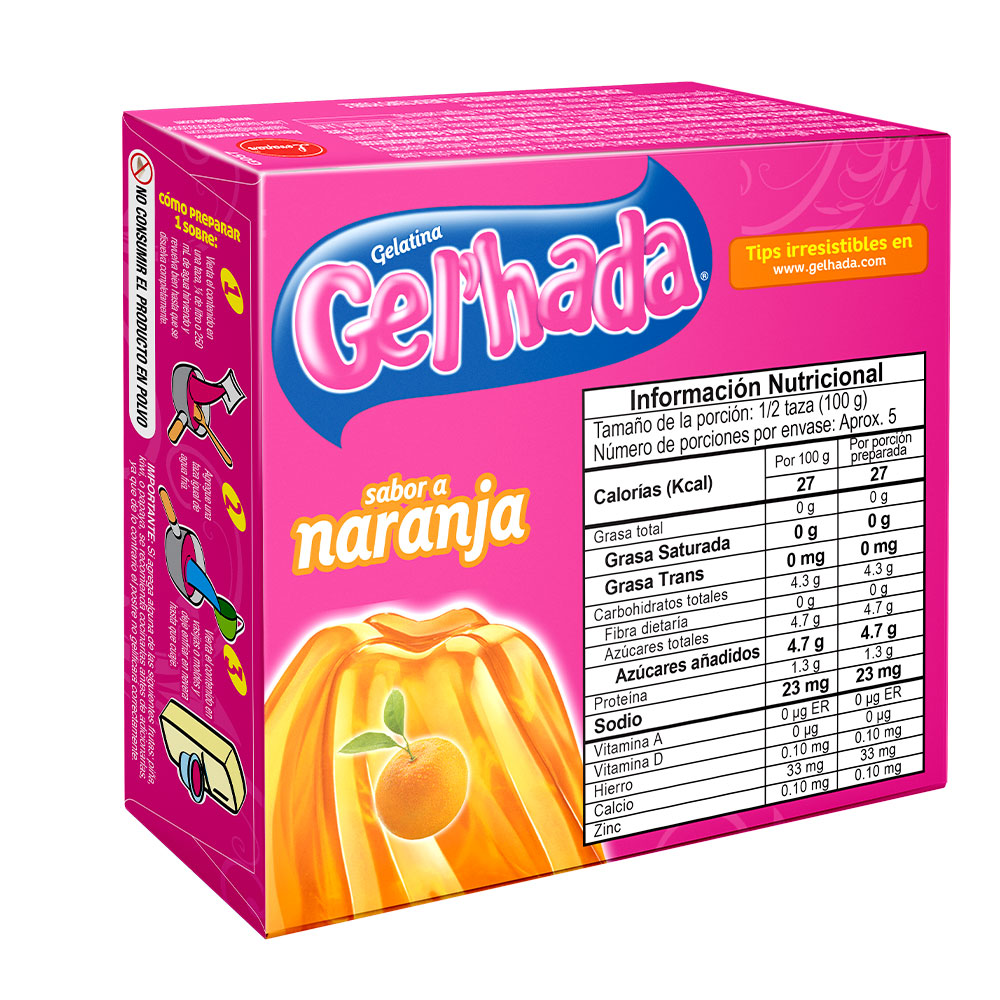 La gelatina es una proteína pura, natural, procedente de materia prima animal, que contiene colágeno. Su consistencia firme y delicioso sabor hacen que Gel’hada sea la #1 en la mente del consumidor. Sabor a naranja. Rendidora. Postre económico para toda la familia.