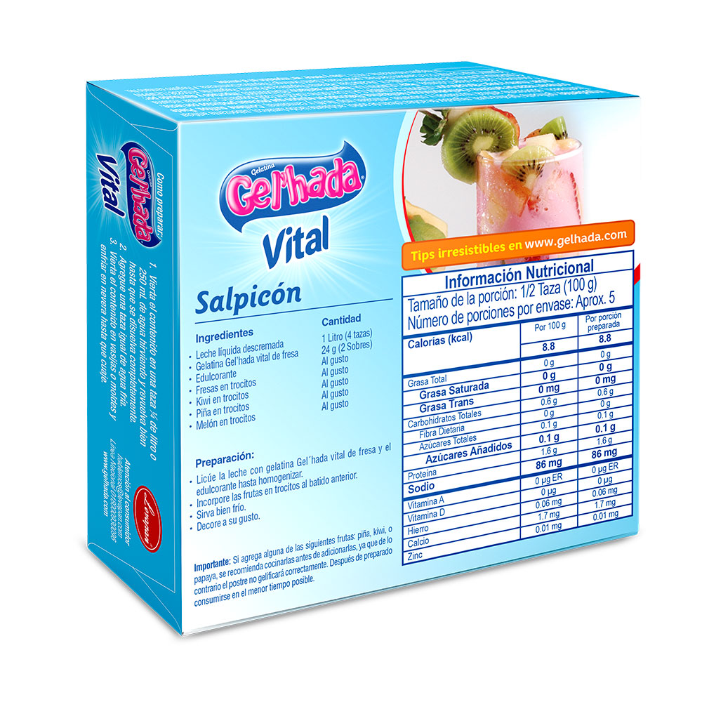 La gelatina es una proteína pura, natural, procedente de materia prima animal, que contiene colágeno. Su consistencia firme y delicioso sabor hacen que Gel’hada sea la #1 en la mente del consumidor. Sabor a fresa. Rendidora. Postre económico para toda la familia. Vital. Light, dietética, sin azúcar. Rinde 5 porciones por sobre.