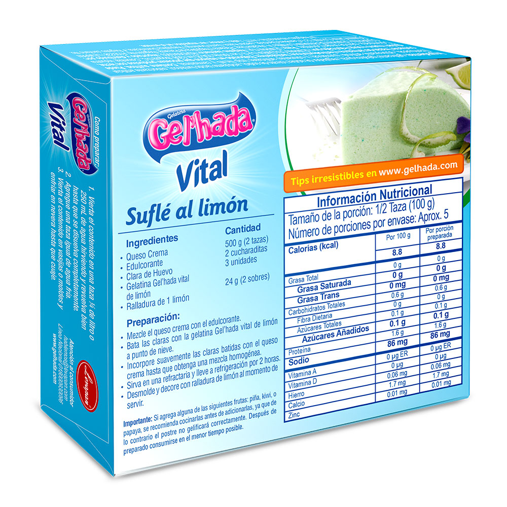 La gelatina es una proteína pura, natural, procedente de materia prima animal, que contiene colágeno. Su consistencia firme y delicioso sabor hacen que Gel’hada sea la #1 en la mente del consumidor. Sabor a limón. Rendidora. Postre económico para toda la familia. Vital. Light, dietética, sin azúcar.
