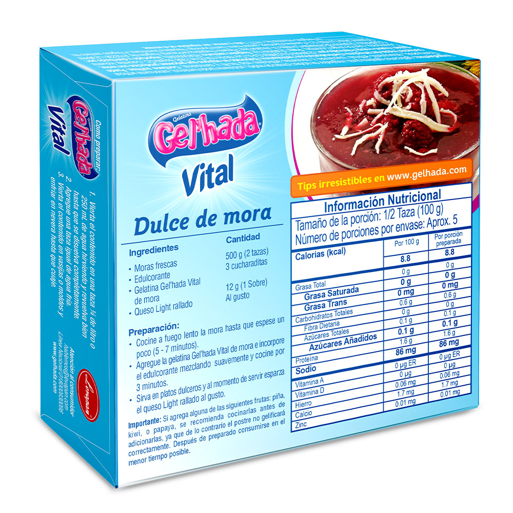 La gelatina es una proteína pura, natural, procedente de materia prima animal, que contiene colágeno. Su consistencia firme y delicioso sabor hacen que Gel’hada sea la #1 en la mente del consumidor. Sabor a mora. Rendidora. Postre económico para toda la familia. Vital. Light, dietética, sin azúcar.