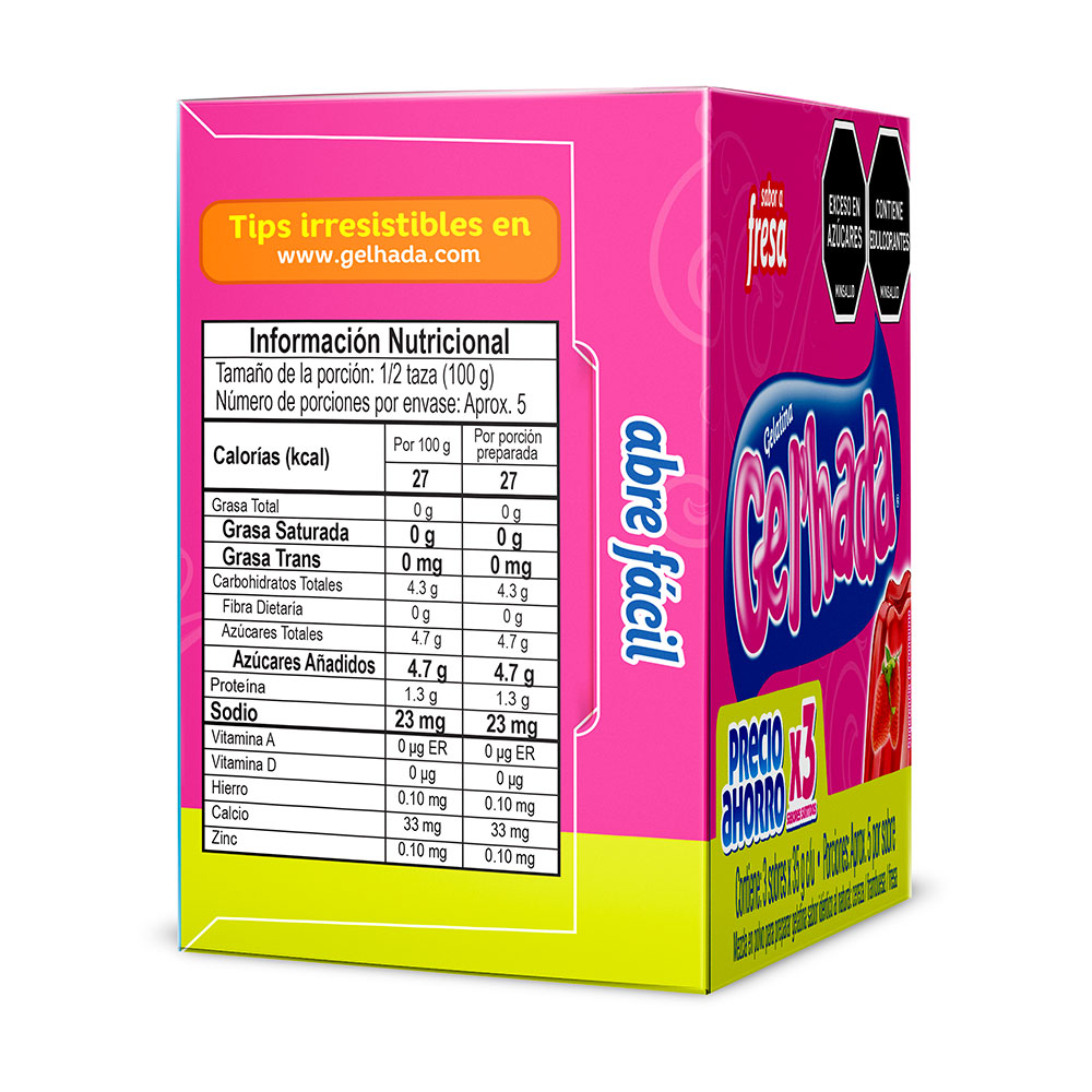 • La gelatina es una proteína pura, natural, procedente de materia prima animal, que contiene colágeno. Su consistencia firme y delicioso sabor hacen que Gel’hada sea la #1 en la mente del consumidor. Sabores surtidos. Rendidora. Postre económico para toda la familia.