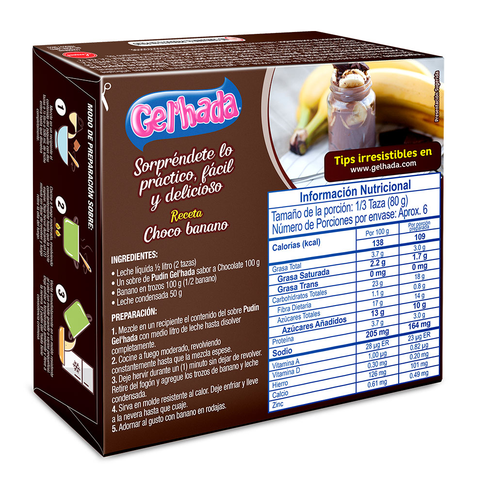 Postre de consistencia cremosa, a base de leche. Sabor chocolate. Rendidor. Postre económico para toda la familia. Solo agregue leche.